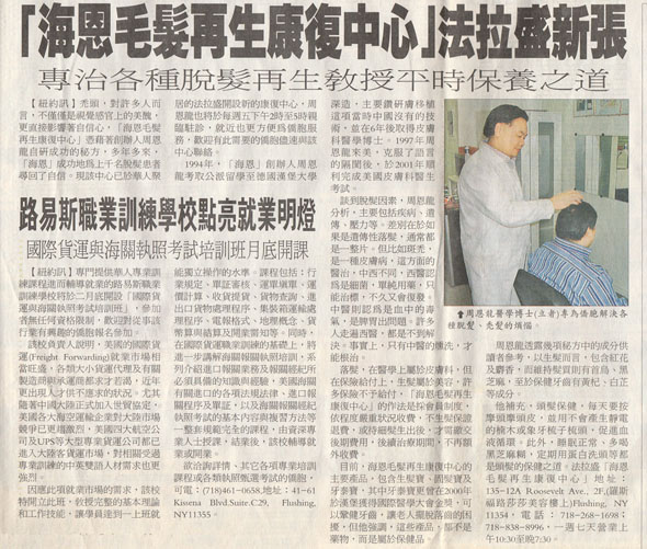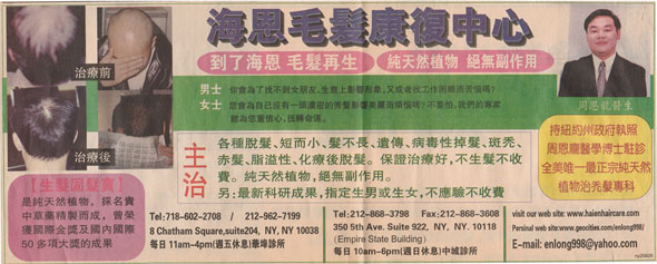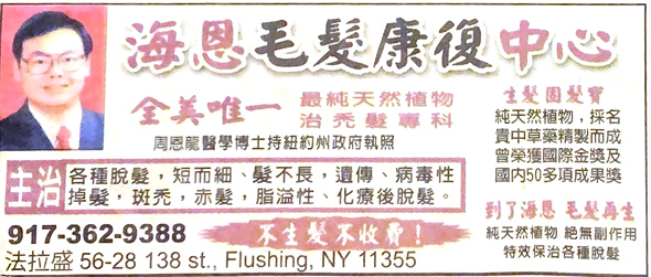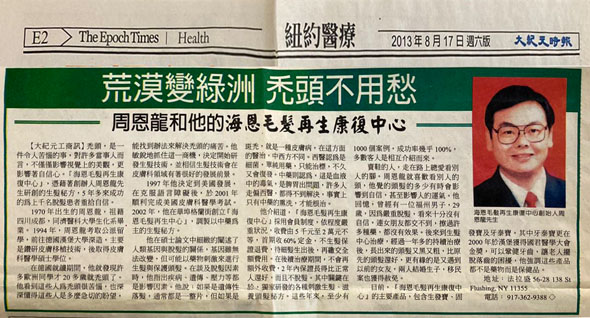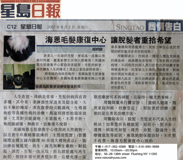 著名發明家周恩龍博士從毛髮再生治療30年,結合中醫古方與現代醫學理論,苦心專研23年,成功研製高檔植物精華藥劑海恩精品套裝,榮獲國內外醫藥類大獎59項.此藥自1997年上市以來,治愈毛髮患者十萬人,為全美唯一使用純天然植物治療毛髮康復的藥物,療效神奇,多年來在廣大患者中樹立"到了海恩,毛髮再生"的美譽海恩生髮3大原理達到止脫、黑髮、控油、固法的功效: